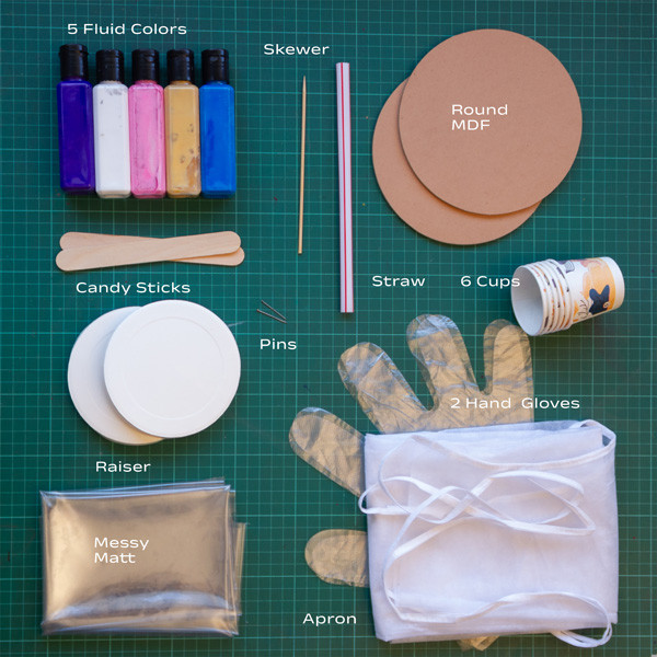 In the Kit - 5 Premix Fluid Colors, 6 Small Cups, 2 Hand Gloves, 6 Coasters , cleaning cloth, messy matt, Apron, skewer sticks